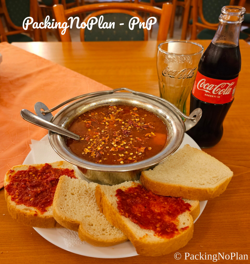 The soup I ate at Baradla Ä–tteren was (compared to how we know it) watery, full of herbs & spices and filled with: carrot, bell pepper, onion, potato and pork.